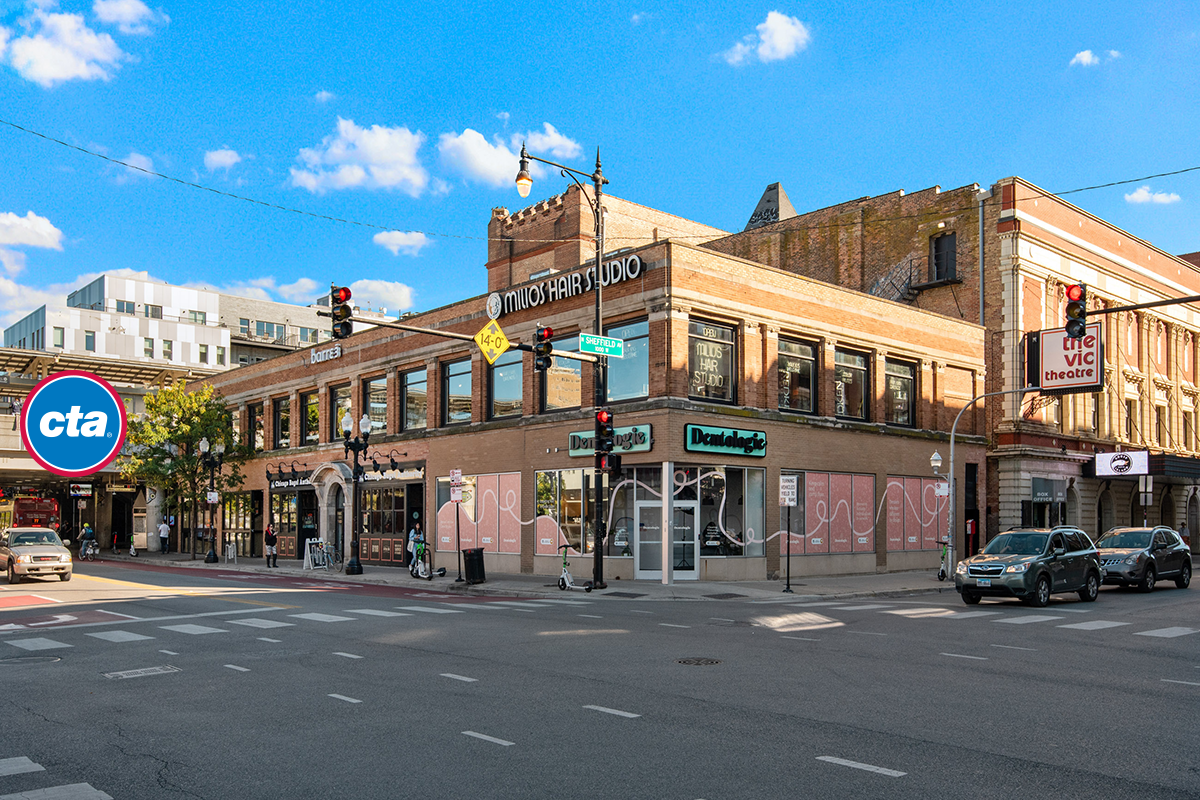 Corner location with high visibility at the intersection of Belmont and Sheffield Avenues in Lakeview. Located at the entrance of the Belmont CTA station, with 2.3M riders from this entrance in 2023. Adjacent to the Vic Theatre. Join Chicago Bagel Authority, Chipotle, and Dentologie.